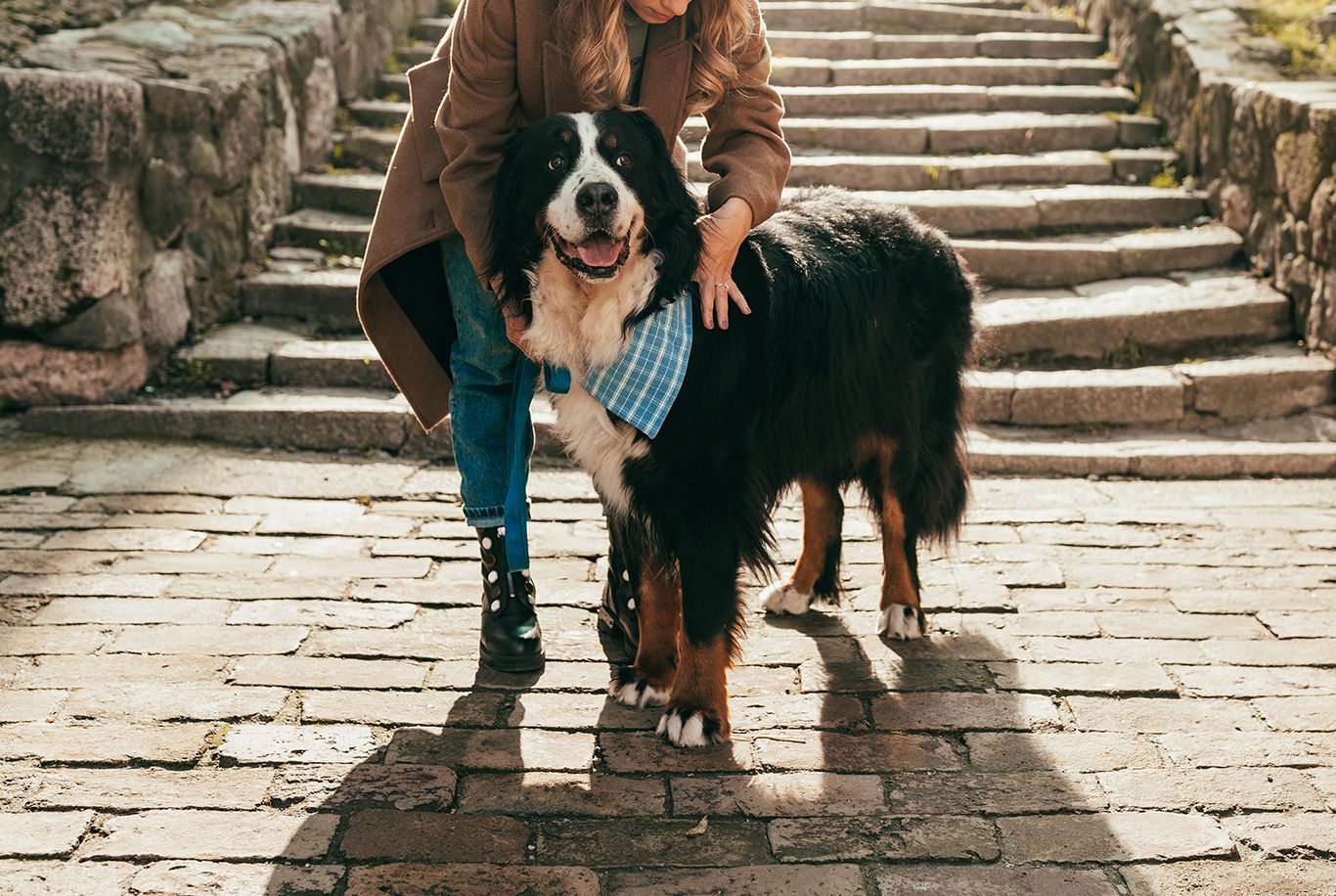 Young Bernese mountain dogs can try to pull the leash on walks. Get your dog a sturdy collar and a leash. Try to avoid bright coloured fabric collars, as they can stain the coat on your dog's neck. Bernese mountain dogs need durable and properly sized toys - avoid smaller objects, as your dog can easily swallow or choke on them.
